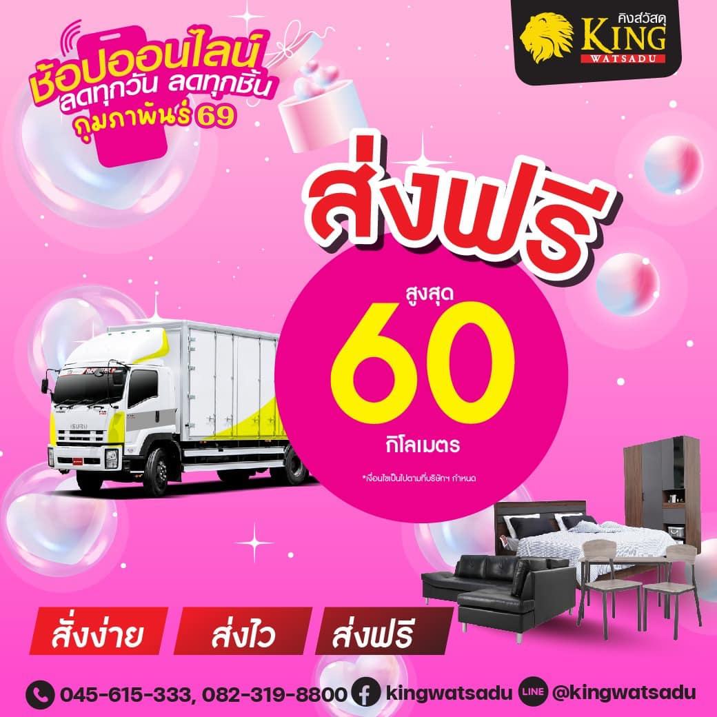 ช้อปออนไลน์ ช้อปคุ้ม ทั้งเดือน คิงส์วัสดุจัดให้ ส่งฟรีสูงสุด 60 กิโลเมตร สั่งวัสดุก่อสร้าง เฟอร์นิเจอร์ ของใช้ในบ้าน ไม่ต้องขนเอง ไม่ต้องเหนื่อย เราส่งถึงบ้าน ฟรี
