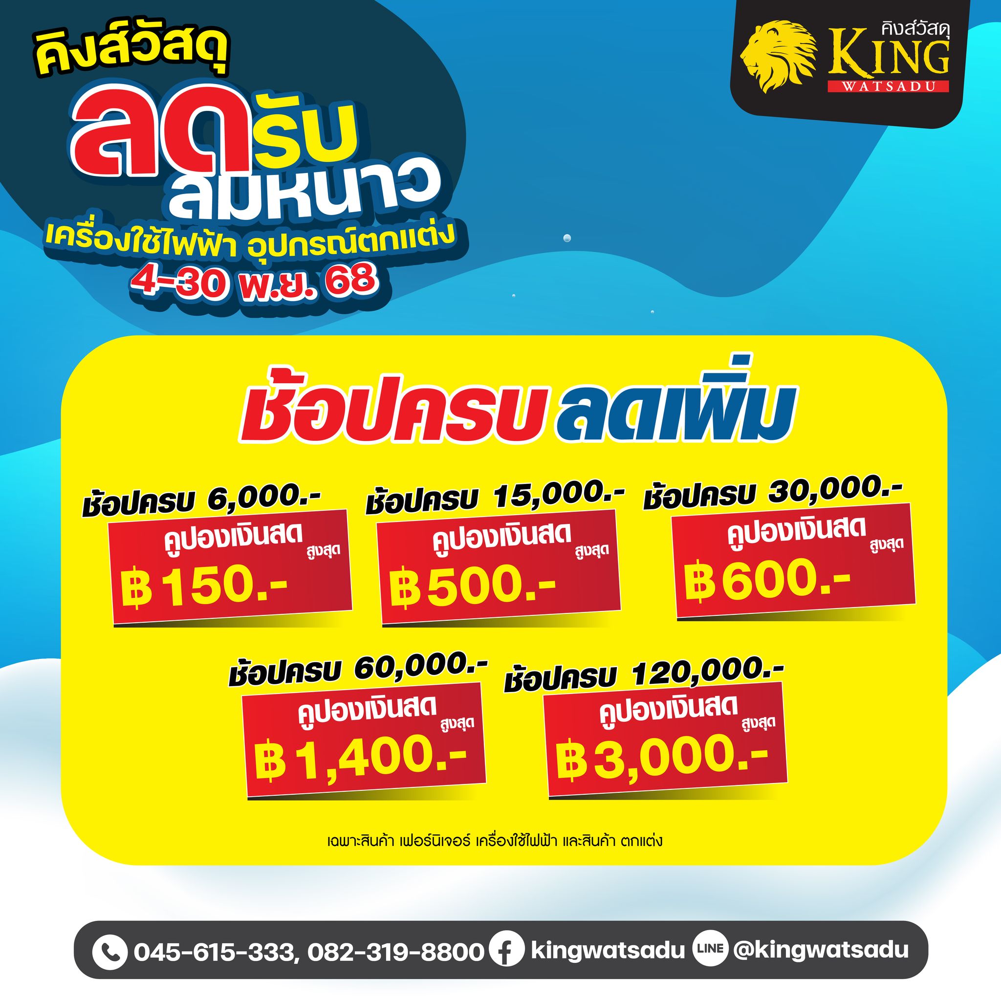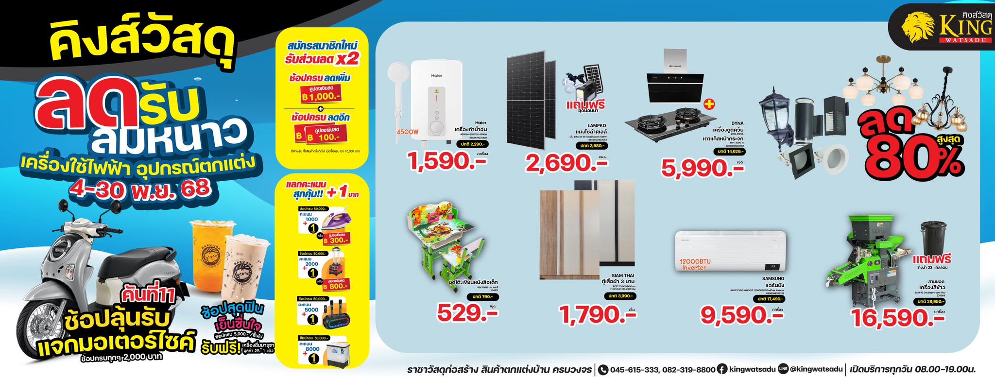พบกับสินค้าเฟอร์นิเจอร์ ห้องน้ำ ห้องครัว และสินค้าอื่นๆ อีกมากมาย ช้อปลุ้นรับ ฃ้อปรับฟรี ช้อปแลกซื้อ ห้ามพลาด ที่คิงส์วัสดุ เท่านั้น